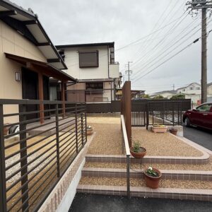 来客の駐車も余裕があるほどの 広々とした駐車スペースになりました。 特徴的なステップと門扉とは対照的な スッキリとしたフェンスです。