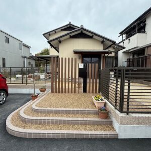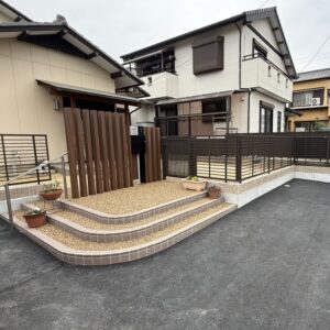 来客の駐車も余裕があるほどの 広々とした駐車スペースになりました。 特徴的なステップと門扉とは対照的な スッキリとしたフェンスです。